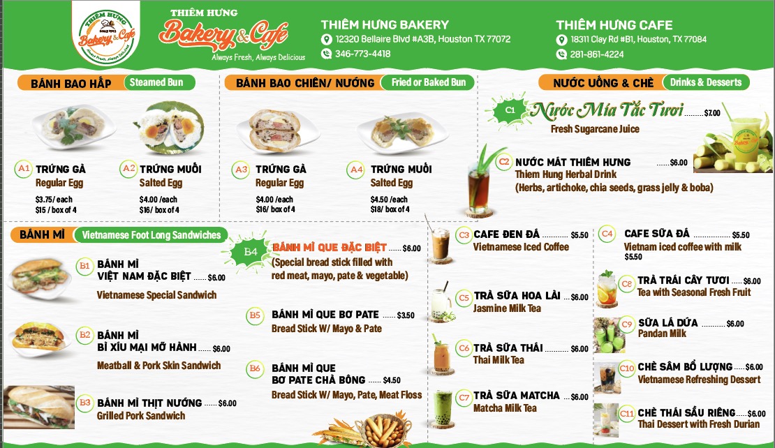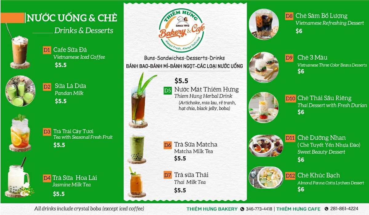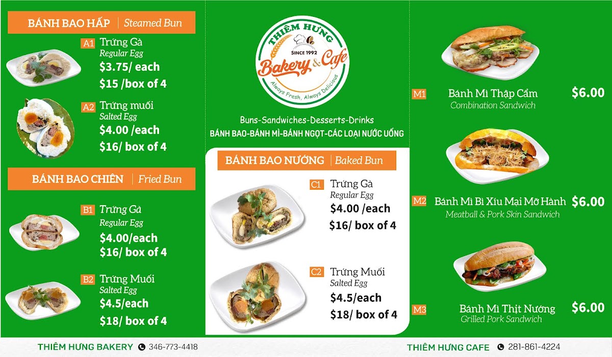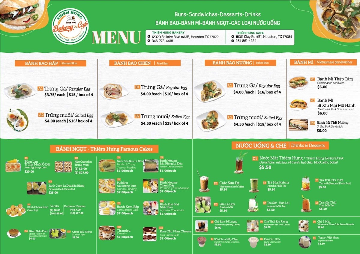 The menu at Thiem Hung Bakery offers a cozy and approachable selection of Vietnamese bakery classics alongside casual café fare. It’s the kind of place where you can enjoy simple, comforting bites and satisfying drinks throughout the day—from a quick breakfast on the go to a relaxed afternoon treat.