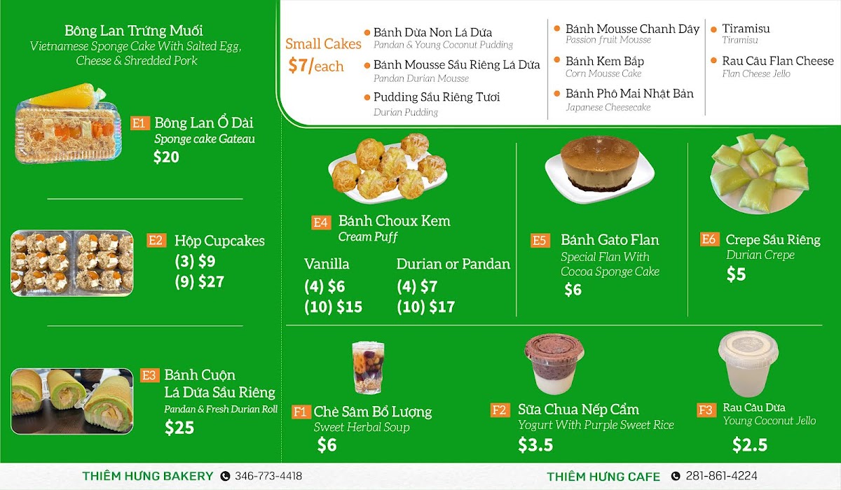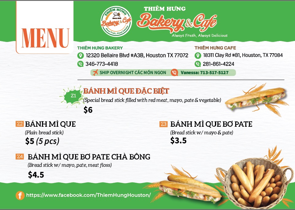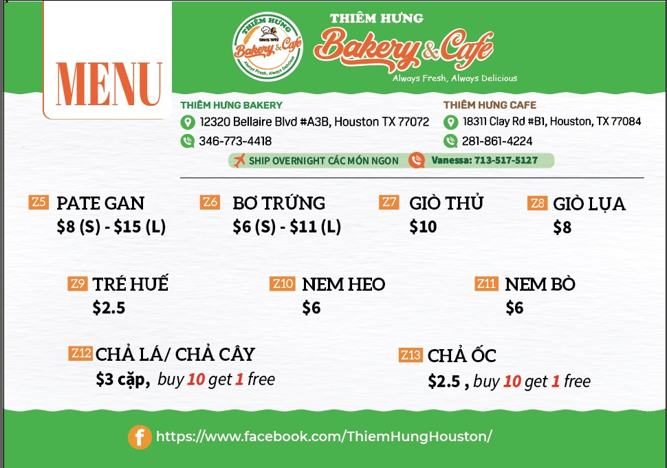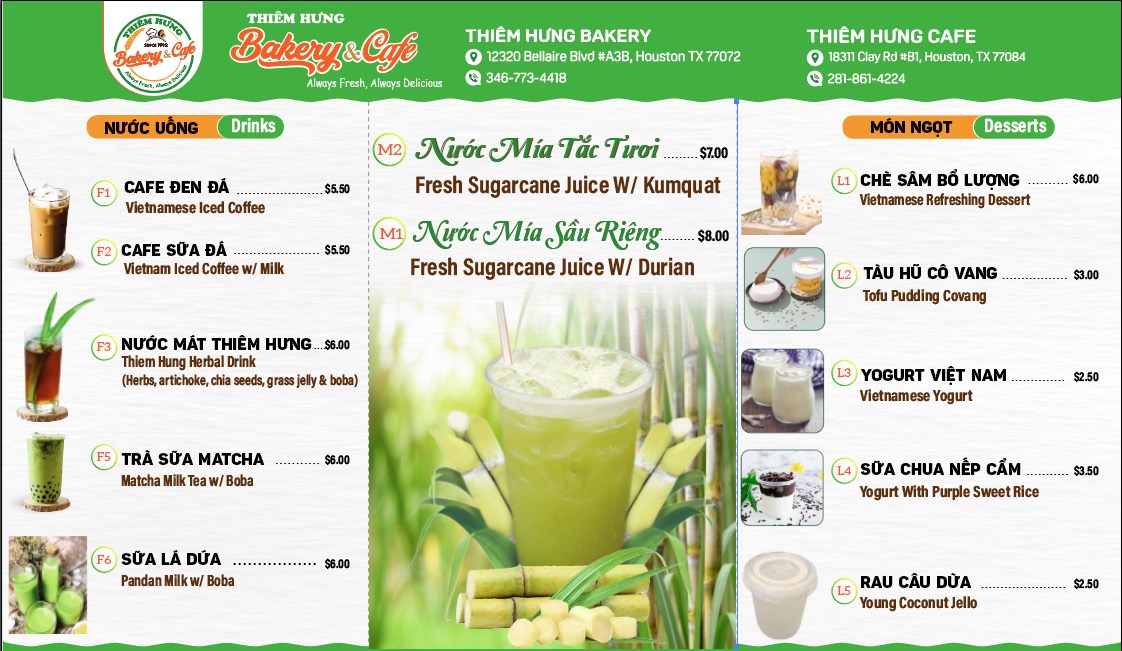 The menu at Thiem Hung Bakery offers a cozy and approachable selection of Vietnamese bakery classics alongside casual café fare. It’s the kind of place where you can enjoy simple, comforting bites and satisfying drinks throughout the day—from a quick breakfast on the go to a relaxed afternoon treat.