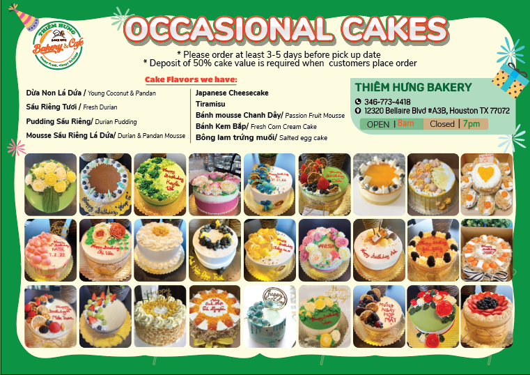 Expect to find fresh, flavorful bánh mì sandwiches, warm and fluffy bánh bao buns, and a variety of traditional cakes such as salted egg cake and pandan rolls. Seasonal specialties like mooncakes and festive cakes for birthdays or weddings add a thoughtful touch to the assortment.